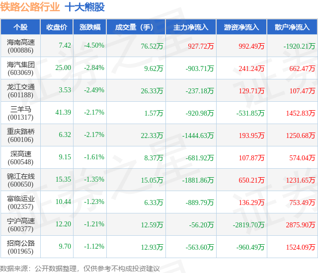 个股表现方面,铁路公路行业当日领跌股为海南高速(000886),该股当日报收7.42,下跌4.5%,成交量76.52万,主力资金净流入927.72万元。海汽集团(603069)以下跌2.84%紧随其后,该股当日成交量9.62万,主力资金净流出903.71万元。除此之外,龙江交通(601188)、三羊马(001317)、重庆路桥(600106)均进入当日熊股之列。具体个股列表见下表: