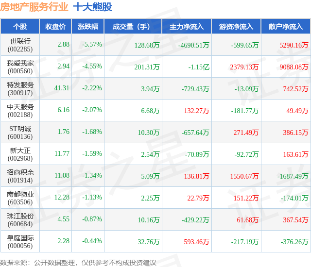 个股表现方面,房地产服务行业当日领跌股为世联行(002285),该股当日报收2.88,下跌5.57%,成交量128.68万,主力资金净流出4690.51万元。我爱我家(000560)以下跌4.55%紧随其后,该股当日成交量201.31万,主力资金净流出1.15亿元。除此之外,特发服务(300917)、中天服务(002188)、ST明诚(600136)均进入当日熊股之列。具体个股列表见下表:
