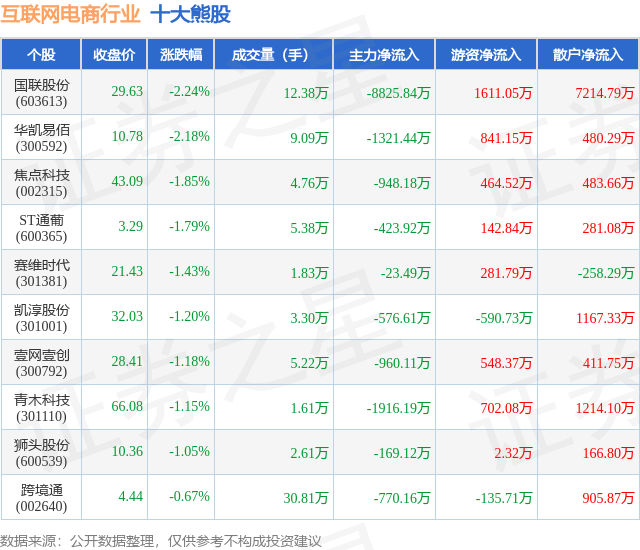 个股表现方面,互联网电商行业当日领跌股为国联股份(603613),该股当日报收29.63,下跌2.24%,成交量12.38万,主力资金净流出8825.84万元。华凯易佰(300592)以下跌2.18%紧随其后,该股当日成交量9.09万,主力资金净流出1321.44万元。除此之外,焦点科技(002315)、ST通葡(600365)、赛维时代(301381)均进入当日熊股之列。具体个股列表见下表: