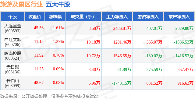 个股表现方面,旅游及景区行业当日领涨股为大连圣亚(600593),该股当日报收45.56,上涨1.61%,成交量8.58万,主力资金净流入2486.81万元。曲江文旅(600706)以上涨1.27%紧随其后,该股当日成交量19.18万,主力资金净流入1201.46万元。除此之外,岭南控股(000524)、天目湖(603136)、长白山(603099)均进入当日牛股之列。具体个股列表见下表: