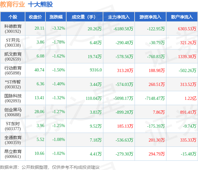 个股表现方面,教育行业当日领跌股为科德教育(300192),该股当日报收20.11,下跌3.32%,成交量20.26万,主力资金净流出6180.58万元。ST开元(300338)以下跌1.78%紧随其后,该股当日成交量6.48万,主力资金净流出290.48万元。除此之外,凯文教育(002659)、行动教育(605098)、*ST传智(003032)均进入当日熊股之列。具体个股列表见下表: