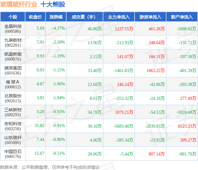 个股表现方面,玻璃玻纤行业当日领跌股为金晶科技(600586),该股当日报收5.69,下跌4.37%,成交量46.86万,主力资金净流入1237.55万元。九鼎新材(002201)以下跌2.1%紧随其后,该股当日成交量13.96万,主力资金净流出212.93万元。除此之外,凯盛新能(600876)、旗滨集团(601636)、南 玻A(000012)均进入当日熊股之列。具体个股列表见下表:
