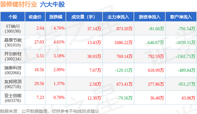 个股表现方面,装修建材行业当日领涨股为ST纳川(300198),该股当日报收2.64,上涨4.76%,成交量37.14万,主力资金净流入873.2万元。晶雪节能(301010)以上涨4.61%紧随其后,该股当日成交量13.43万,主力资金净流入1686.22万元。除此之外,开尔新材(300234)、瑞泰科技(002066)、友邦吊顶(002718)均进入当日牛股之列。具体个股列表见下表: