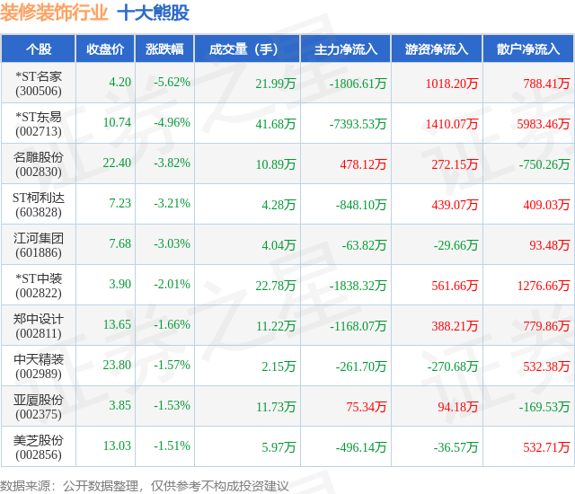 个股表现方面,装修装饰行业当日领跌股为*ST名家(300506),该股当日报收4.2,下跌5.62%,成交量21.99万,主力资金净流出1806.61万元。*ST东易(002713)以下跌4.96%紧随其后,该股当日成交量41.68万,主力资金净流出7393.53万元。除此之外,名雕股份(002830)、ST柯利达(603828)、江河集团(601886)均进入当日熊股之列。具体个股列表见下表: