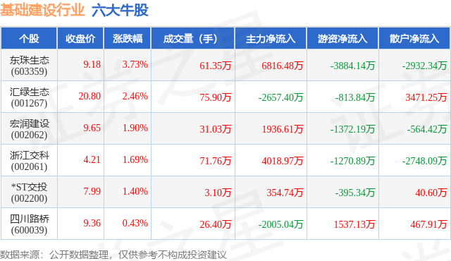 个股表现方面,基础建设行业当日领涨股为东珠生态(603359),该股当日报收9.18,上涨3.73%,成交量61.35万,主力资金净流入6816.48万元。汇绿生态(001267)以上涨2.46%紧随其后,该股当日成交量75.9万,主力资金净流出2657.4万元。除此之外,宏润建设(002062)、浙江交科(002061)、*ST交投(002200)均进入当日牛股之列。具体个股列表见下表: