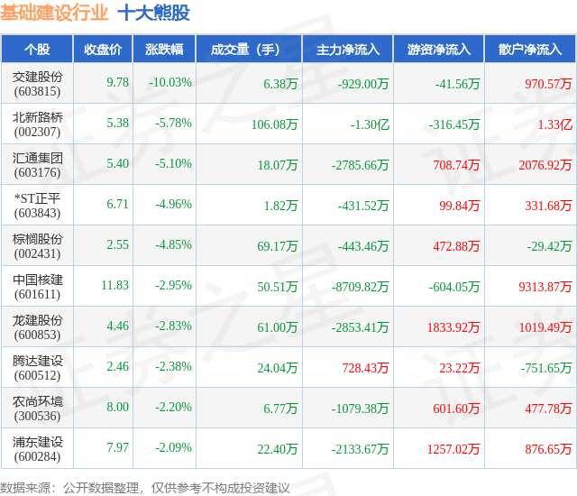 个股表现方面,基础建设行业当日领跌股为交建股份(603815),该股当日报收9.78,下跌10.03%,成交量6.38万,主力资金净流出929.0万元。北新路桥(002307)以下跌5.78%紧随其后,该股当日成交量106.08万,主力资金净流出1.3亿元。除此之外,汇通集团(603176)、*ST正平(603843)、棕榈股份(002431)均进入当日熊股之列。具体个股列表见下表: