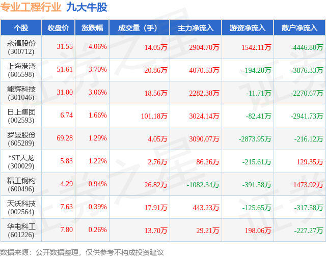 个股表现方面,专业工程行业当日领涨股为永福股份(300712),该股当日报收31.55,上涨4.06%,成交量14.05万,主力资金净流入2904.7万元。上海港湾(605598)以上涨3.7%紧随其后,该股当日成交量20.86万,主力资金净流入4070.53万元。除此之外,能辉科技(301046)、日上集团(002593)、罗曼股份(605289)均进入当日牛股之列。具体个股列表见下表: