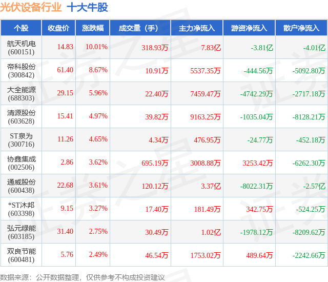 个股表现方面,光伏设备行业当日领涨股为航天机电(600151),该股当日报收14.83,上涨10.01%,成交量318.93万,主力资金净流入7.83亿元。帝科股份(300842)以上涨8.67%紧随其后,该股当日成交量10.91万,主力资金净流入5537.35万元。除此之外,大全能源(688303)、清源股份(603628)、ST泉为(300716)均进入当日牛股之列。具体个股列表见下表: