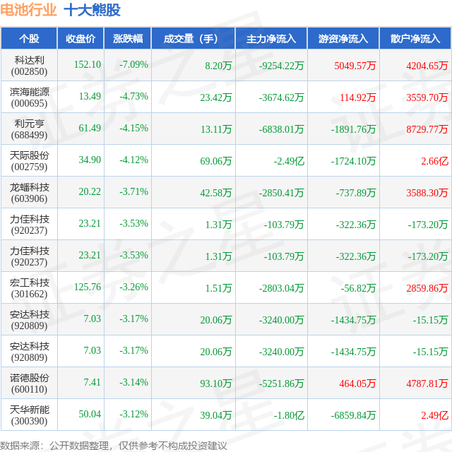 个股表现方面,电池行业当日领跌股为科达利(002850),该股当日报收152.1,下跌7.09%,成交量8.2万,主力资金净流出9254.22万元。滨海能源(000695)以下跌4.73%紧随其后,该股当日成交量23.42万,主力资金净流出3674.62万元。除此之外,利元亨(688499)、天际股份(002759)、龙蟠科技(603906)均进入当日熊股之列。具体个股列表见下表: