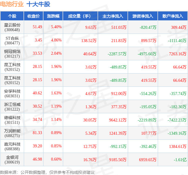 个股表现方面,电池行业当日领涨股为星云股份(300648),该股当日报收51.49,上涨5.4%,成交量9.63万,主力资金净流入511.03万元。ST合纵(300477)以上涨4.86%紧随其后,该股当日成交量138.52万,主力资金净流入211.83万元。除此之外,铜冠铜箔(301217)、昆工科技(920152)、昆工科技(920152)均进入当日牛股之列。具体个股列表见下表: