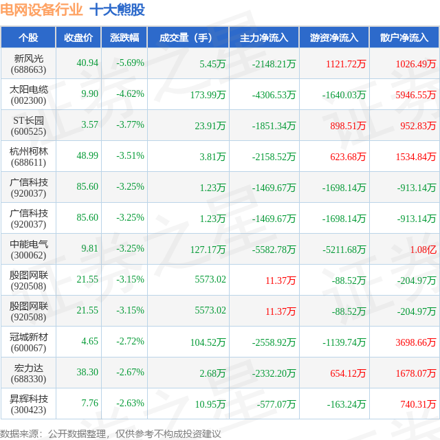 个股表现方面,电网设备行业当日领跌股为新风光(688663),该股当日报收40.94,下跌5.69%,成交量5.45万,主力资金净流出2148.21万元。太阳电缆(002300)以下跌4.62%紧随其后,该股当日成交量173.99万,主力资金净流出4306.53万元。除此之外,ST长园(600525)、杭州柯林(688611)、广信科技(920037)均进入当日熊股之列。具体个股列表见下表:
