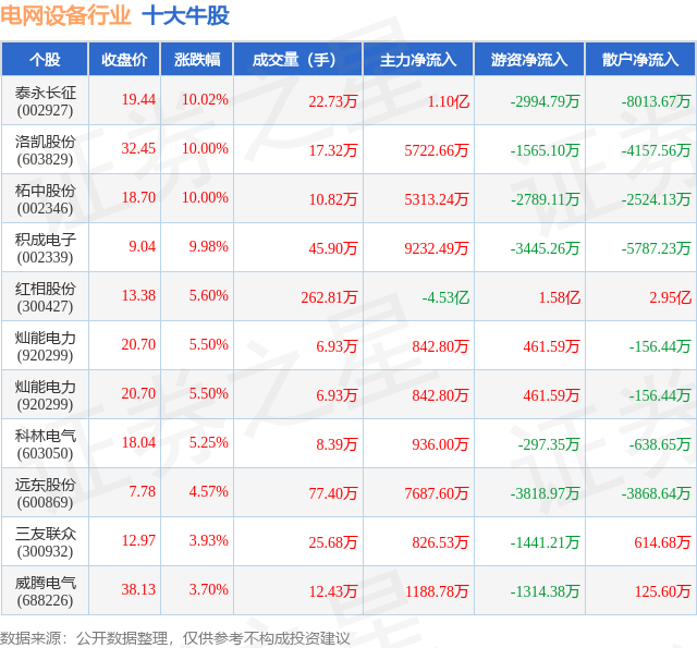 个股表现方面,电网设备行业当日领涨股为泰永长征(002927),该股当日报收19.44,上涨10.02%,成交量22.73万,主力资金净流入1.1亿元。洛凯股份(603829)以上涨10.0%紧随其后,该股当日成交量17.32万,主力资金净流入5722.66万元。除此之外,柘中股份(002346)、积成电子(002339)、红相股份(300427)均进入当日牛股之列。具体个股列表见下表:
