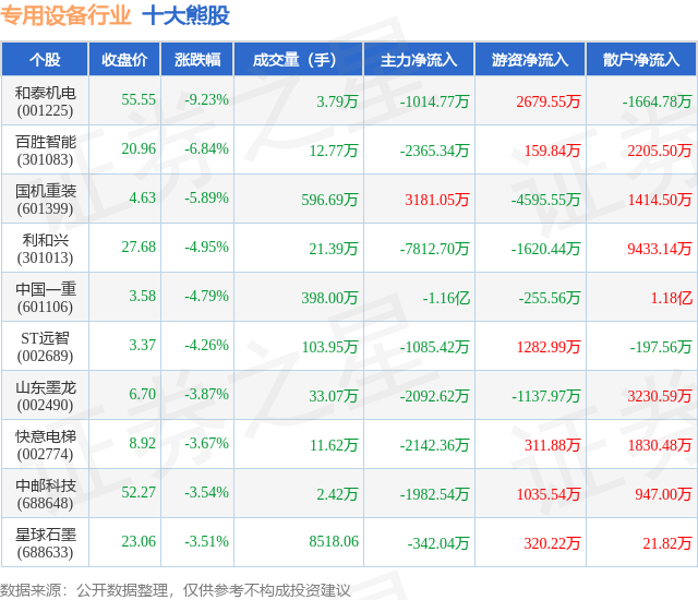 个股表现方面,专用设备行业当日领跌股为和泰机电(001225),该股当日报收55.55,下跌9.23%,成交量3.79万,主力资金净流出1014.77万元。百胜智能(301083)以下跌6.84%紧随其后,该股当日成交量12.77万,主力资金净流出2365.34万元。除此之外,国机重装(601399)、利和兴(301013)、中国一重(601106)均进入当日熊股之列。具体个股列表见下表: