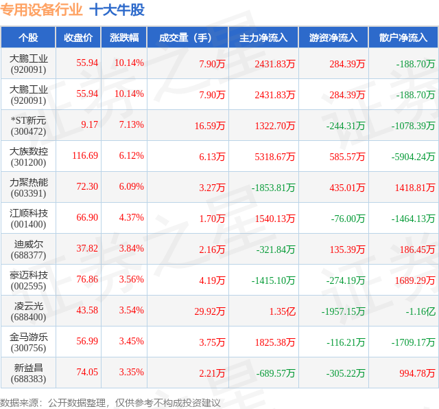 个股表现方面,专用设备行业当日领涨股为大鹏工业(920091),该股当日报收55.94,上涨10.14%,成交量7.9万,主力资金净流入2431.83万元。大鹏工业(920091)以上涨10.14%紧随其后,该股当日成交量7.9万,主力资金净流入2431.83万元。除此之外,*ST新元(300472)、大族数控(301200)、力聚热能(603391)均进入当日牛股之列。具体个股列表见下表: