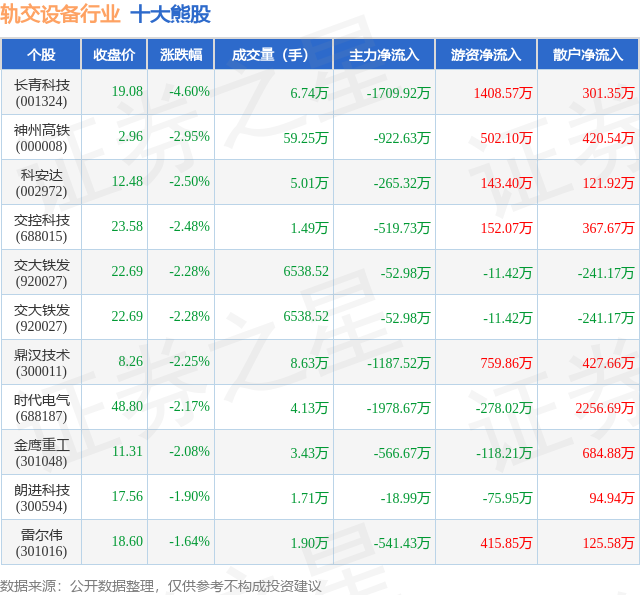 个股表现方面,轨交设备行业当日领跌股为长青科技(001324),该股当日报收19.08,下跌4.6%,成交量6.74万,主力资金净流出1709.92万元。神州高铁(000008)以下跌2.95%紧随其后,该股当日成交量59.25万,主力资金净流出922.63万元。除此之外,科安达(002972)、交控科技(688015)、交大铁发(920027)均进入当日熊股之列。具体个股列表见下表: