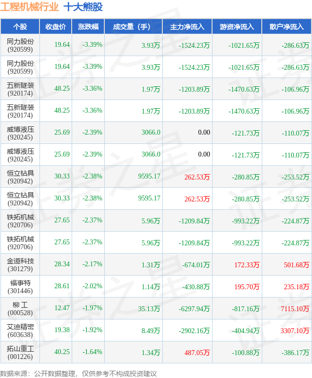 个股表现方面,工程机械行业当日领跌股为同力股份(920599),该股当日报收19.64,下跌3.39%,成交量3.93万,主力资金净流出1524.23万元。同力股份(920599)以下跌3.39%紧随其后,该股当日成交量3.93万,主力资金净流出1524.23万元。除此之外,五新隧装(920174)、五新隧装(920174)、威博液压(920245)均进入当日熊股之列。具体个股列表见下表: