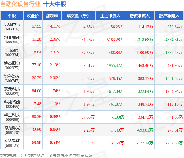个股表现方面,自动化设备行业当日领涨股为信捷电气(603416),该股当日报收57.95,上涨4.11%,成交量4.85万,主力资金净流入156.23万元。均普智能(688306)以上涨2.36%紧随其后,该股当日成交量31.28万,主力资金净流入5183.28万元。除此之外,英威腾(002334)、博杰股份(002975)、锐科激光(300747)均进入当日牛股之列。具体个股列表见下表: