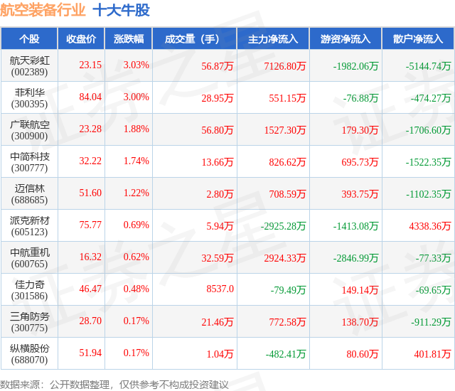个股表现方面,航空装备行业当日领涨股为航天彩虹(002389),该股当日报收23.15,上涨3.03%,成交量56.87万,主力资金净流入7126.8万元。菲利华(300395)以上涨3.0%紧随其后,该股当日成交量28.95万,主力资金净流入551.15万元。除此之外,广联航空(300900)、中简科技(300777)、迈信林(688685)均进入当日牛股之列。具体个股列表见下表: