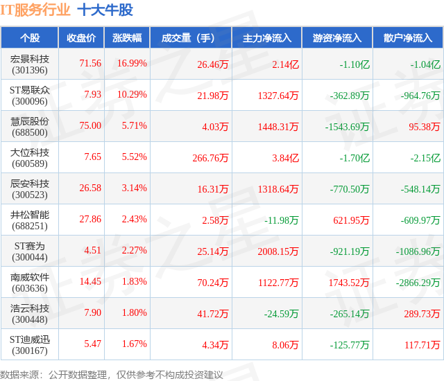 个股表现方面,IT服务行业当日领涨股为宏景科技(301396),该股当日报收71.56,上涨16.99%,成交量26.46万,主力资金净流入2.14亿元。ST易联众(300096)以上涨10.29%紧随其后,该股当日成交量21.98万,主力资金净流入1327.64万元。除此之外,慧辰股份(688500)、大位科技(600589)、辰安科技(300523)均进入当日牛股之列。具体个股列表见下表: