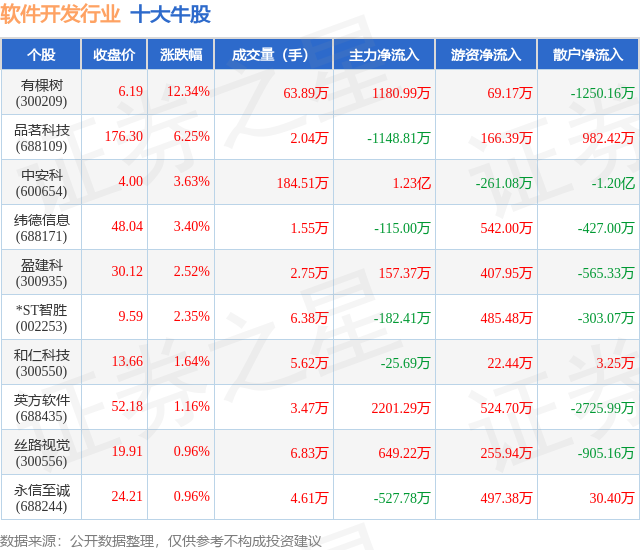 个股表现方面,软件开发行业当日领涨股为有棵树(300209),该股当日报收6.19,上涨12.34%,成交量63.89万,主力资金净流入1180.99万元。品茗科技(688109)以上涨6.25%紧随其后,该股当日成交量2.04万,主力资金净流出1148.81万元。除此之外,中安科(600654)、纬德信息(688171)、盈建科(300935)均进入当日牛股之列。具体个股列表见下表: