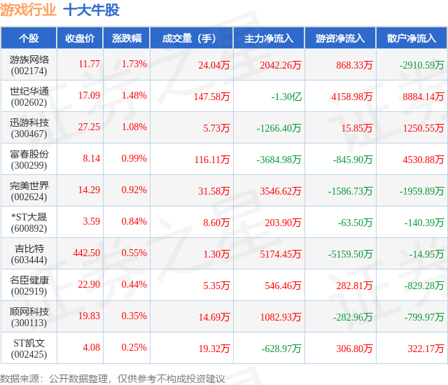 个股表现方面,游戏行业当日领涨股为游族网络(002174),该股当日报收11.77,上涨1.73%,成交量24.04万,主力资金净流入2042.26万元。世纪华通(002602)以上涨1.48%紧随其后,该股当日成交量147.58万,主力资金净流出1.3亿元。除此之外,迅游科技(300467)、富春股份(300299)、完美世界(002624)均进入当日牛股之列。具体个股列表见下表: