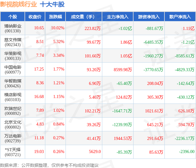 个股表现方面,影视院线行业当日领涨股为博纳影业(001330),该股当日报收10.65,上涨10.02%,成交量223.82万,主力资金净流出1.02亿元。慈文传媒(002343)以上涨5.32%紧随其后,该股当日成交量99.67万,主力资金净流入1.86亿元。除此之外,华策影视(300133)、中国电影(600977)、华智数媒(300426)均进入当日牛股之列。具体个股列表见下表: