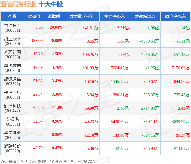 个股表现方面,通信服务行业当日领涨股为恒信东方(300081),该股当日报收6.53,上涨20.04%,成交量141.31万,主力资金净流入2.21亿元。线上线下(300959)以上涨20.0%紧随其后,该股当日成交量9.65万,主力资金净流入1.6亿元。除此之外,光环新网(300383)、奥飞数据(300738)、超讯通信(603322)均进入当日牛股之列。具体个股列表见下表: