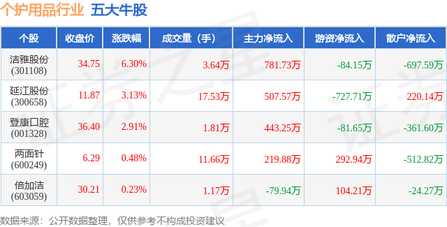 个股表现方面,个护用品行业当日领涨股为洁雅股份(301108),该股当日报收34.75,上涨6.3%,成交量3.64万,主力资金净流入781.73万元。延江股份(300658)以上涨3.13%紧随其后,该股当日成交量17.53万,主力资金净流入507.57万元。除此之外,登康口腔(001328)、两面针(600249)、倍加洁(603059)均进入当日牛股之列。具体个股列表见下表: