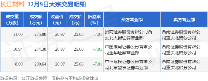 证券之星消息,12月9日长江材料发生大宗交易,交易数据如下: