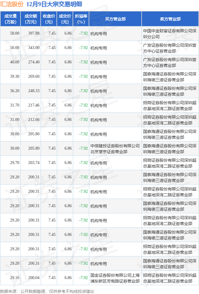 证券之星消息,12月9日汇洁股份发生大宗交易,交易数据如下: