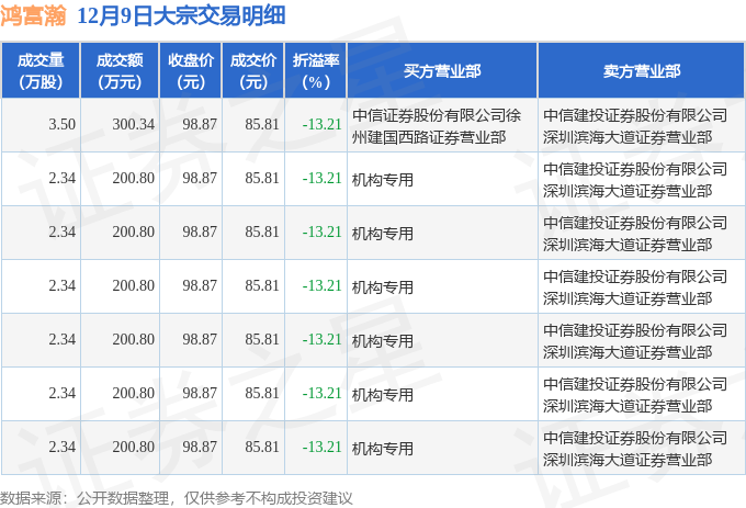 证券之星消息,12月9日鸿富瀚发生大宗交易,交易数据如下: