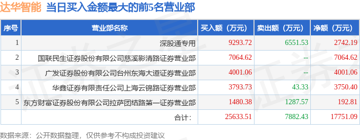 证券之星消息,沪深交易所2025年12月9日公布的交易公开信息显示,达华智能(002512)因日涨幅偏离值达到7%的前5只证券登上龙虎榜。此次是近5个交易日内第3次上榜。