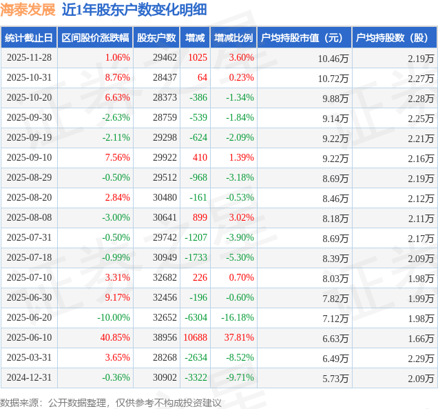从股价来看,2025年10月31日至2025年11月28日,海泰发展区间涨幅为1.06%,在此期间股东户数增加1025.0户,增幅为3.6%。