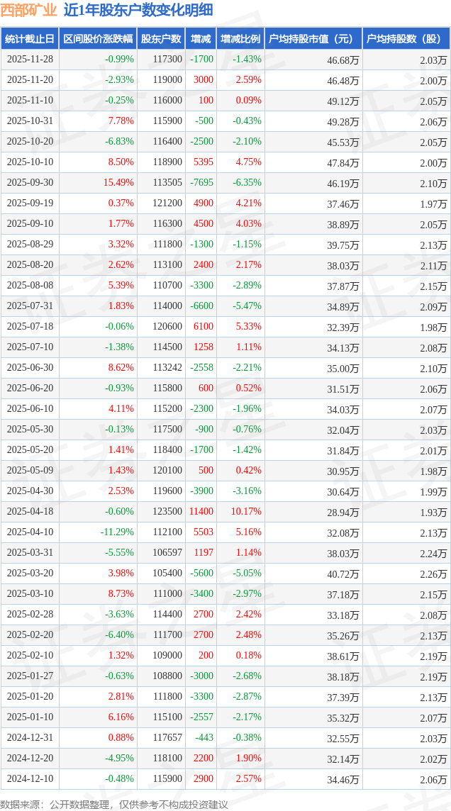 从股价来看,2025年11月20日至2025年11月28日,西部矿业区间跌幅为0.99%,在此期间股东户数减少1700.0户,减幅为1.43%。