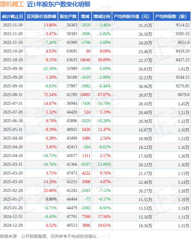 从股价来看,2025年11月20日至2025年11月30日,国机精工区间涨幅为13.86%,在此期间股东户数减少2020.0户,减幅为3.46%。