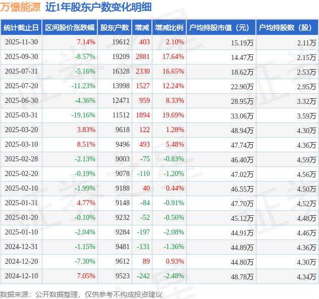 从股价来看,2025年9月30日至2025年11月30日,万憬能源区间涨幅为7.14%,在此期间股东户数增加403.0户,增幅为2.1%。