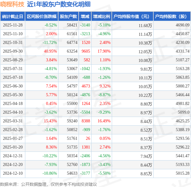 从股价来看,2025年11月10日至2025年11月28日,晓程科技区间跌幅为0.52%,在此期间股东户数减少3140.0户,减幅为5.1%。