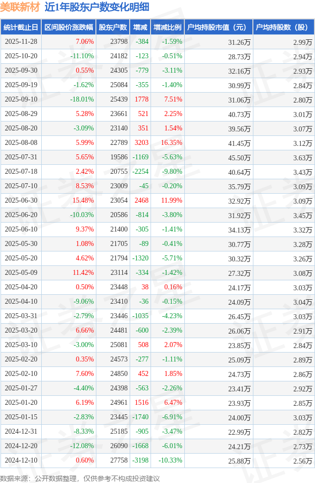 从股价来看,2025年10月20日至2025年11月28日,美联新材区间涨幅为7.06%,在此期间股东户数减少384.0户,减幅为1.59%。