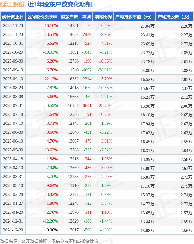 从股价来看,2025年11月20日至2025年11月28日,延江股份区间涨幅为16.1%,在此期间股东户数增加74.0户,增幅为0.5%。
