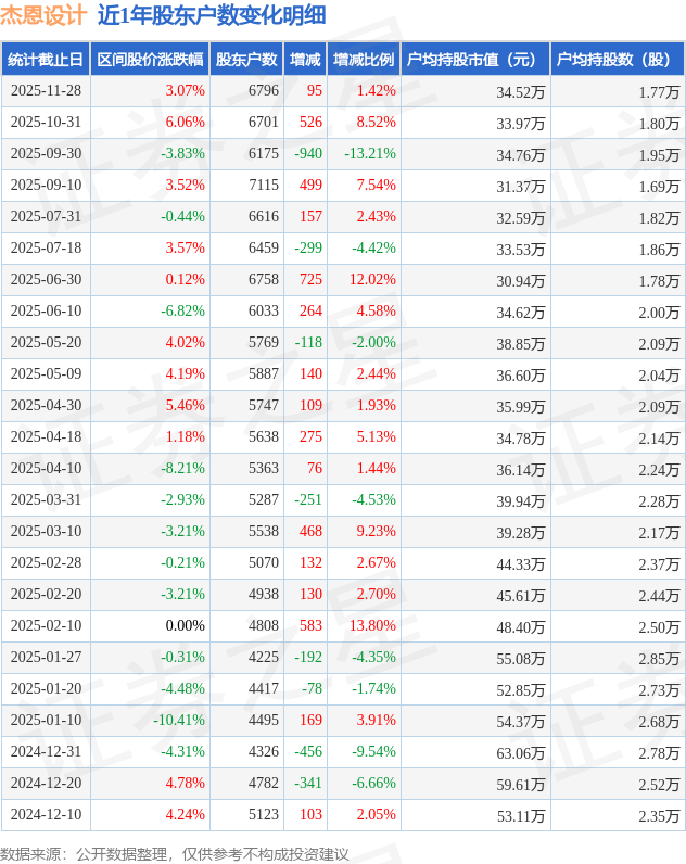 证券之星消息,近日杰恩设计披露,截至2025年11月28日公司股东户数为6796.0户,较10月31日增加95.0户,增幅为1.42%。户均持股数量由上期的1.8万股减少至1.77万股,户均持股市值为34.52万元。