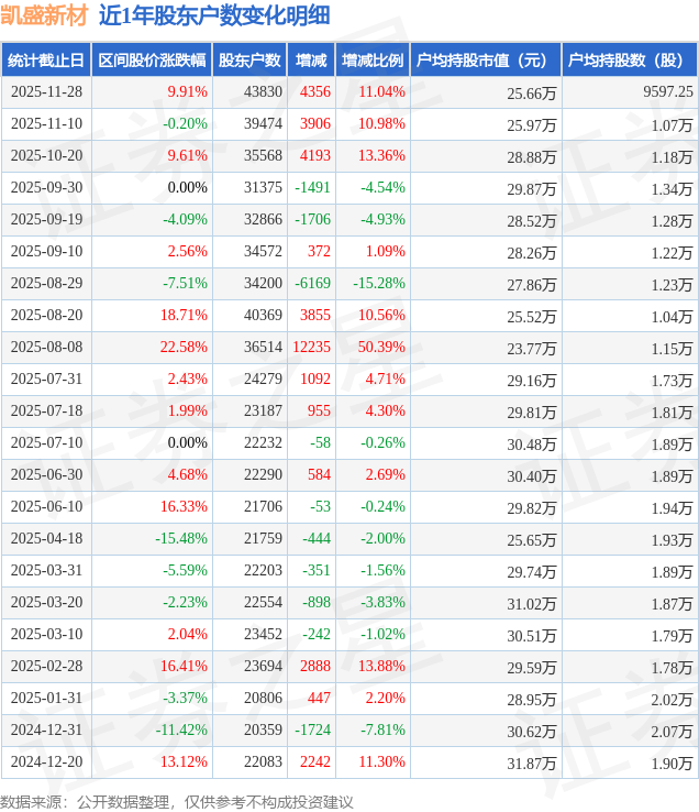 从股价来看,2025年11月10日至2025年11月28日,凯盛新材区间涨幅为9.91%,在此期间股东户数增加4356.0户,增幅为11.04%。