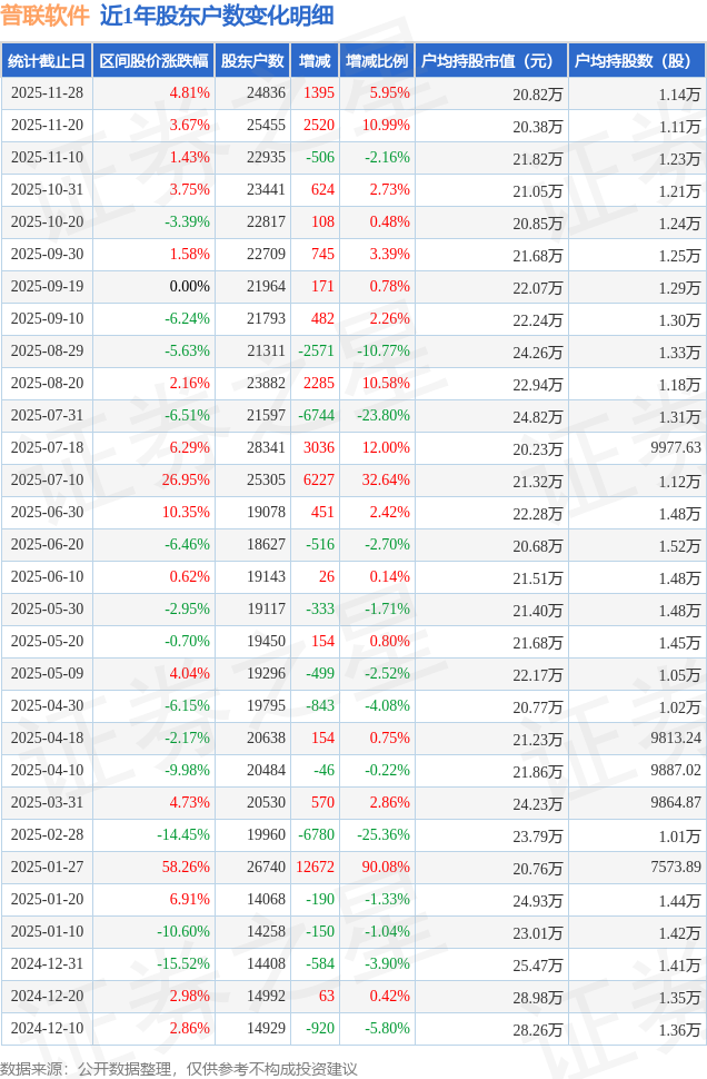 从股价来看,2025年10月31日至2025年11月28日,普联软件区间涨幅为4.81%,在此期间股东户数增加1395.0户,增幅为5.95%。