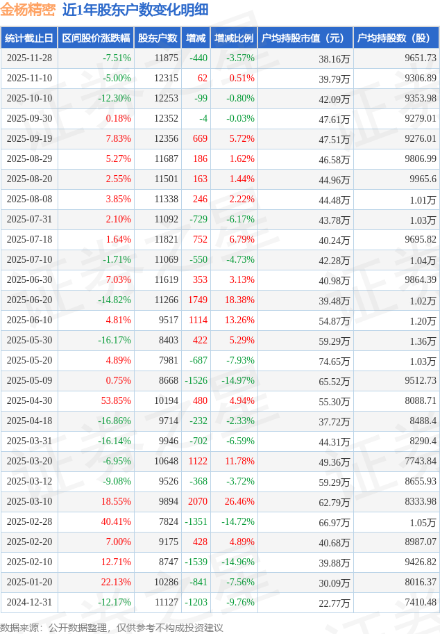 从股价来看,2025年11月10日至2025年11月28日,金杨精密区间跌幅为7.51%,在此期间股东户数减少440.0户,减幅为3.57%。