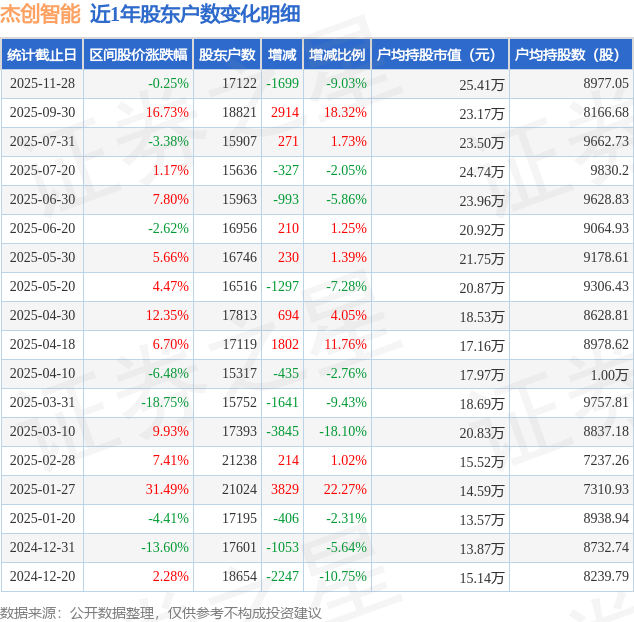 从股价来看,2025年9月30日至2025年11月28日,杰创智能区间跌幅为0.25%,在此期间股东户数减少1699.0户,减幅为9.03%。