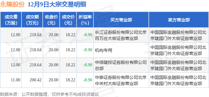 证券之星消息,12月9日永臻股份发生大宗交易,交易数据如下:
