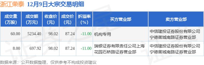 证券之星消息,12月9日浙江荣泰发生大宗交易,交易数据如下: