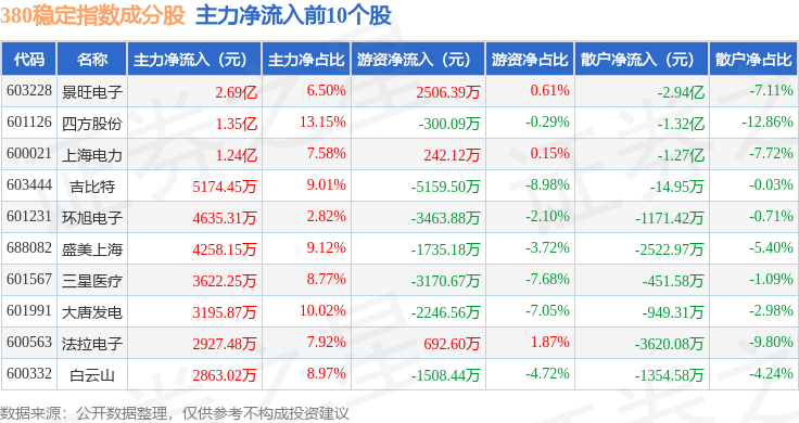 资金流向方面,380稳定(000142)指数成份股当日主力资金净流出合计21.83亿元,游资资金净流入合计9.86亿元,散户资金净流入合计11.96亿元。成份股资金流向详情见下表: