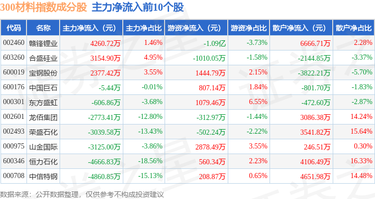 资金流向方面,300材料(000909)指数成份股当日主力资金净流出合计60.4亿元,游资资金净流入合计19.59亿元,散户资金净流入合计40.81亿元。成份股资金流向详情见下表: