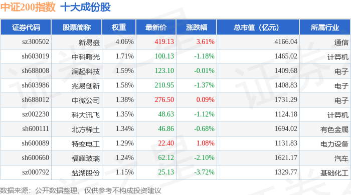 证券之星消息,12月9日,中证200(000904)指数报收于5540.9点,跌0.65%,成交2293.85亿元,换手率1.17%。当日该指数成份股中,上涨的有45家,生益科技以7.43%的涨幅领涨,下跌的有152家,中国中冶以10.03%的跌幅领跌。