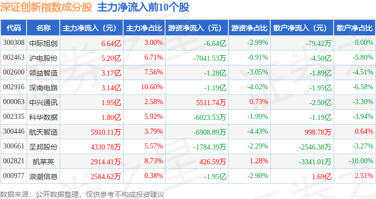 资金流向方面,深证创新(399016)指数成份股当日主力资金净流出合计43.88亿元,游资资金净流入合计3.39亿元,散户资金净流入合计40.49亿元。成份股资金流向详情见下表: